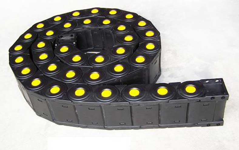 塑料拖鏈由兩個(gè)側(cè)鏈連接在一起,頂部和底部通過(guò)橋接件連接在一起。